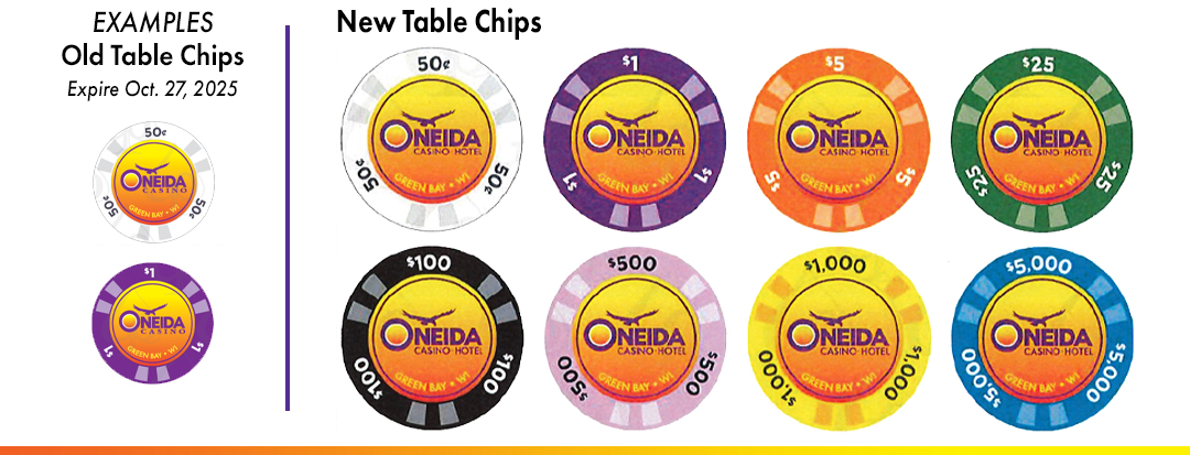 Table Games has updated their chips. All previous chips will be discontinued on Monday, Oct. 27, 2025, and will no longer be accepted at any Oneidea Casino Gaming Properties.